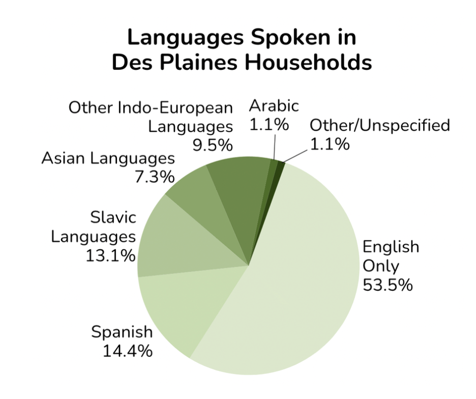 Des Plaines is a diverse city with 33% of residents being born outside of the U.S. and 45% of residents speaking a language other than English at home. Interpretation and translation services to resident-serving organizations, such as those provided by LanguageLine Solutions, could ensure all residents can access information and assistance.